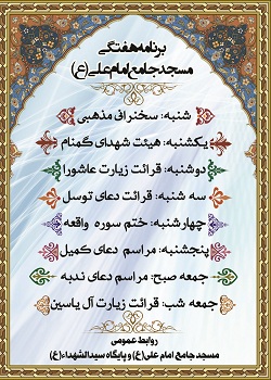 به گزارش پایگاه تخصصی مسجد به نقل از ناحیه علامه طباطبایی مسجد امام علی (ع) شهرستان پردیس برنامه های هفتگی خود را برای استفاده نمازگزاران اعلام نمود.